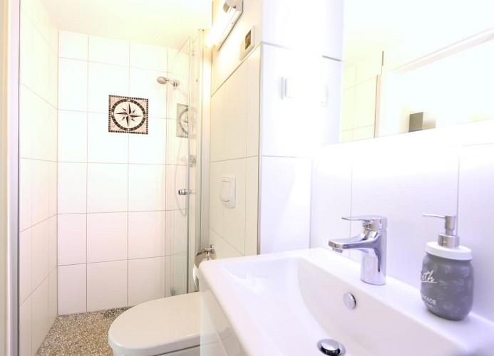 Das Bad bietet eine Dusche, Waschbecken, Fön, Fußbodenheizung und WC.
